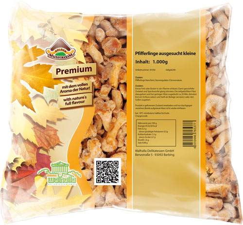 Unsere handverlesenen Pfifferlinge sind gewaschen und durchblanchiert. Dadurch können die küchenfertig vorbereiteten Pilze ohne Gewichtsverlust beim Anschwenken verwendet werden. Kopfdurchmesser bis 35 mm